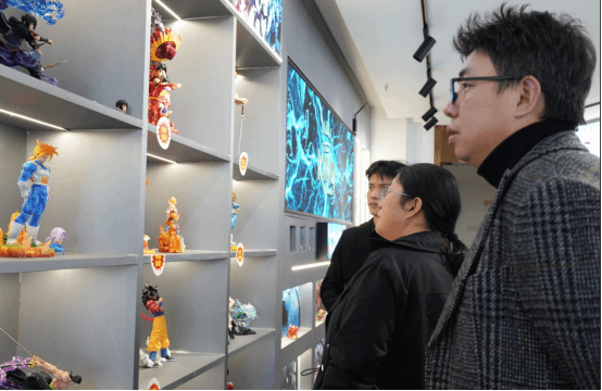在产业园相关负责人的陪同下,三位老师深入园区内部,实地探访了企业的运营现场与特色展厅。从“货通全球”的宏大愿景展示区,到陈列着各类潮流商品、包括精致动漫手办在内的选品中心,再到配备先进设备的直播场景,调研团队切身感受到了跨境电商业态的多样性与创新活力。